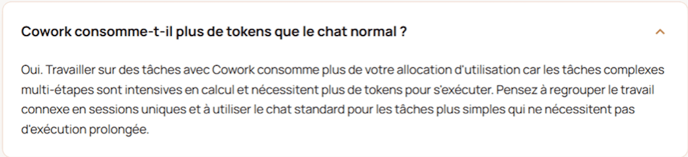 La FAQ de Claude est explicite sur la forte consommation de tokens par Cowork