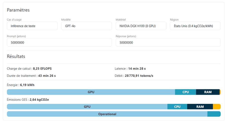 Estimation par le simulateur de Digital4Better des émissions de 100 million de tokens de GPT 4o avec une répartition à 50% entre les tokens d'entrée et ceux de sortie.